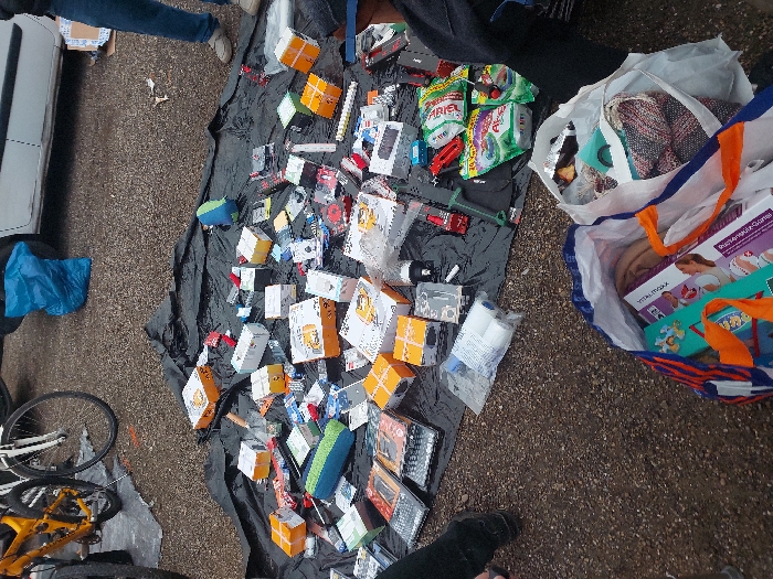 The scene depicts an outdoor market stall located in Eckbolsheim, France. A black tarp is spread on dark, gravelly ground, displaying numerous items for sale. These items include a multitude of small cardboard boxes, many secured with orange tape, along with blister-packaged electronics, various hand tools, a green and blue pencil case, and multiple plastic sachets of green-packaged cleaning products. A transparent plastic bag containing two white cylindrical objects is also present on the tarp. In the upper left background, parts of a yellow mountain bicycle and a white bicycle are visible. A white passenger vehicle is partially observed in the upper right background, with a crumpled blue plastic bag situated near its front tire. Three individuals are partially visible: a person's lower legs in dark attire are at the bottom left; a person's lower legs in blue jeans and light footwear are positioned at the mid-right, standing near the tarp; and an arm with a dark sleeve and a hand are at the bottom right, adjacent to two open shopping bags containing additional merchandise. The arrangement indicates a commercial market environment.