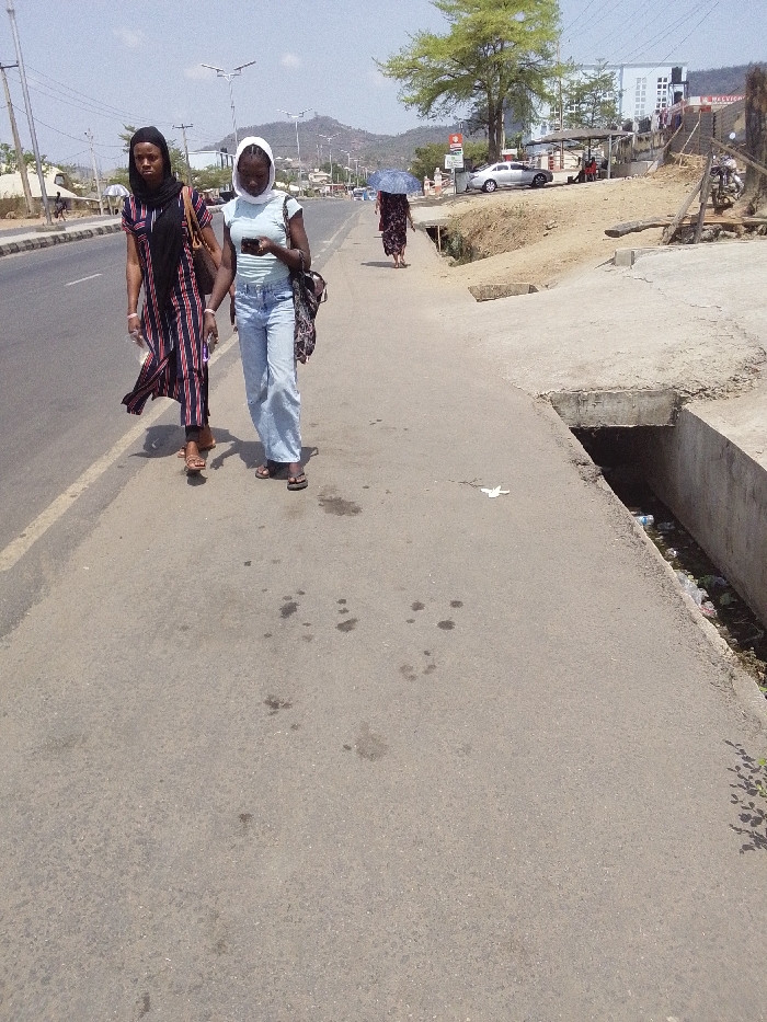 Two women are walking along a paved road. One wears a long, striped garment and a dark head covering; the other wears jeans and a light-colored top, with a white headscarf. A third figure, farther away, carries an umbrella. The road has a drainage ditch lined with debris. In the background are buildings, a tree, a hill, and utility poles.