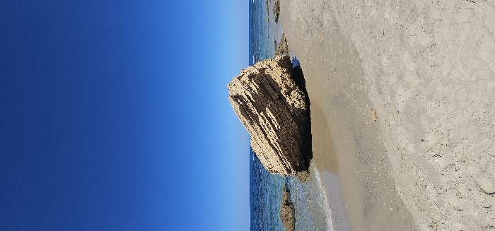 This image depicts a coastal scene in Palmachim, Israel, under a clear sky. The primary subject is a large, irregularly shaped rock formation positioned centrally on a sandy beach. The rock is light tan to yellowish-brown in color, exhibiting distinct horizontal stratification and a rough, eroded texture. Its base is partially submerged in shallow, clear, blue-green ocean water, with small waves gently lapping against it and the adjacent sand. The foreground consists of light beige sand, showing variations in moisture content; darker, wet sand is visible near the water's edge, transitioning to drier, lighter sand further up the beach. Scattered small shell fragments and dark specks are visible on the sand. The ocean extends horizontally across the midground, with a slightly darker blue hue towards the horizon. The sky occupies the upper portion of the frame, presenting a uniform, deep blue and completely devoid of clouds. No individuals, animals, or man-made structures are discernible within the frame. The scene is brightly illuminated, indicating clear, sunny weather conditions.