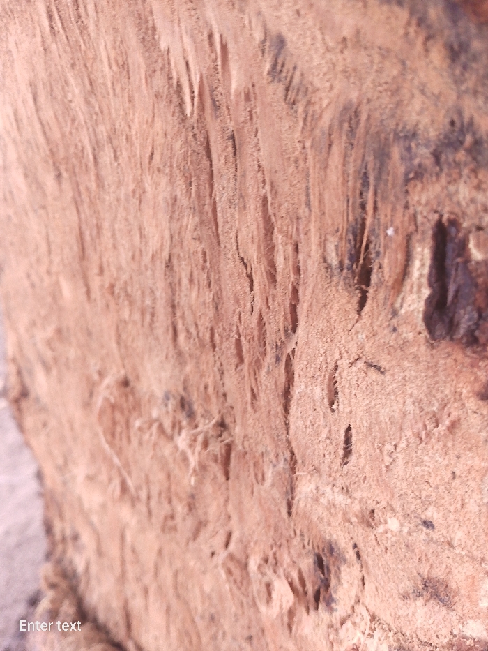 close-up view of rough, splintered wood. The color is a reddish-brown, with darker areas suggesting knots or damage. The texture is coarse and uneven. The environment appears to be outdoors based on the natural material, but the specific location is not discernible from the image. There are no people, subjects, objects, actions, or interactions visible.