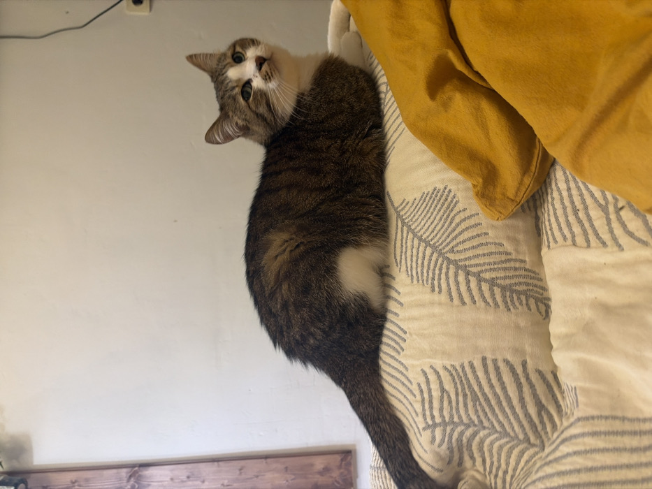 - "A brown tabby cat with white markings is suspended in mid-air, resting on the edge of a bed" by FM-6rQWX2, licensed under CC BY 4.0