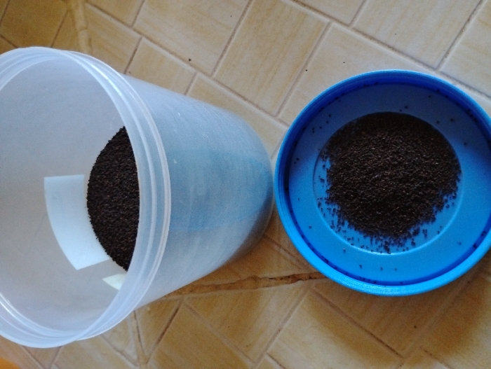 A translucent cylindrical plastic container, partially filled with a dark, finely granular substance, rests on a light brown tiled floor in Kikuyu Township ward, Kenya. A detached, circular blue plastic lid lies on the same tiled surface in the foreground, containing a smaller accumulation of the identical dark granular material. The container exhibits a slight blue tint towards its base. The tiled floor features distinct grout lines. No individuals are present.