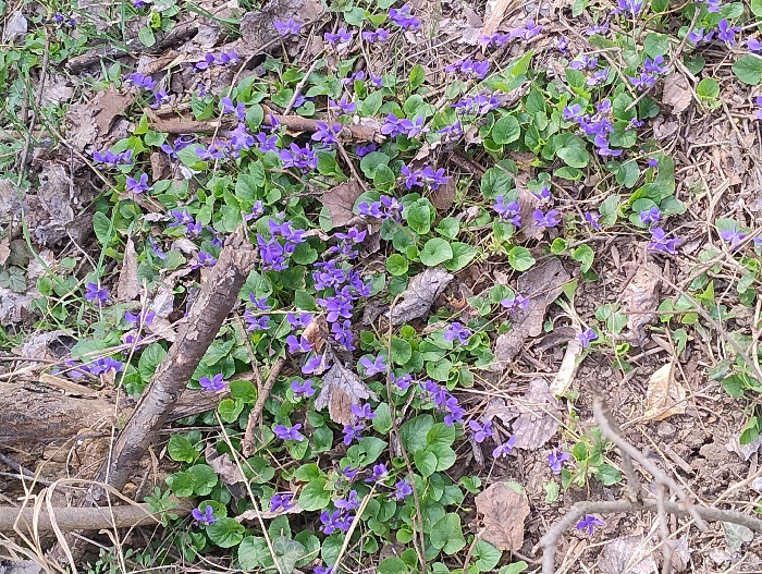 The scene is located in the city of Dolno Linevo, Bulgaria. The image depicts a patch of ground covered by a dense array of small, blooming purple violets (Viola odorata) with their associated green, heart-shaped leaves. The ground surface is composed of dark soil, numerous scattered desiccated brown leaves, and a network of dry, fine twigs and larger branches. One prominent, weathered, dark brown branch lies diagonally across the upper-center portion of the frame. Other thinner, lighter-colored natural debris is visible throughout the vegetated area. No human individuals, animals, or man-made objects are present. The environment is an outdoor natural setting.