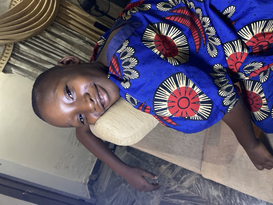 A child, wearing a blue and red patterned garment, is resting their head on a light brown couch. They are lying on their side, facing forward with a gentle smile. Their skin has a slight sheen, reflecting light. The background includes a curtain and a glimpse of a fan. The room is moderately lit, and the child appears relaxed and comfortable. The patterned fabric adds a vibrant touch to the scene.