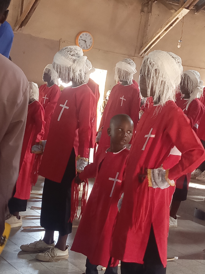 The image depicts an indoor gathering in Akwanga, Nigeria. Approximately ten individuals, primarily children and adolescents of African descent, are visible, uniformly dressed in long-sleeved red tunics with a white cross emblem centered on the chest, worn over black trousers. Their heads are covered with elaborate white headpieces, constructed from either intricate lace or white feathers, featuring long, dense fringes that obscure facial features. Several wear light-colored, possibly grey, wrist coverings with golden-yellow trim at the cuffs. In the immediate foreground, a young male child, similarly attired, holds a cluster of red cords in his right hand while looking towards the left. The interior space features light brown walls, exposed wooden roof beams, and a hard floor. A circular orange-rimmed analog clock on the wall indicates a time between 10:00 and 11:00. A single bare lightbulb hangs from a wire. Footwear consists of various light-colored athletic shoes and canvas sneakers.