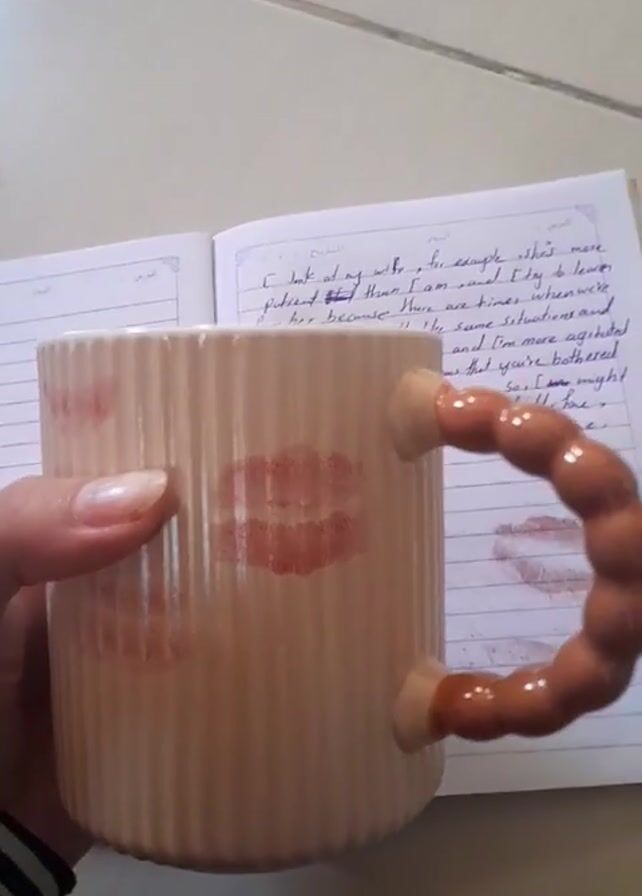 A hand holds a ridged beige mug with several lipstick kiss prints on it, against the background of an open notebook