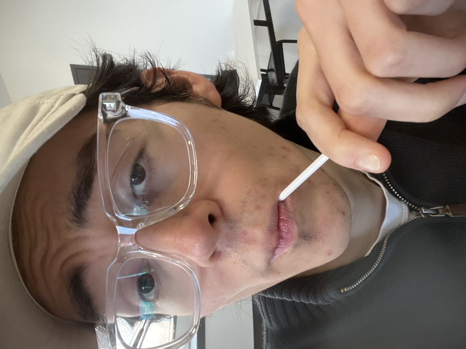 A close-up photograph depicts an individual, likely male, wearing a light-colored baseball cap and clear-framed rectangular glasses. The subject has dark hair and visible stubble on the upper lip and chin, with multiple red blemishes present on the lower face. A dark zippered sweater is worn over a white undershirt. The individual's left hand holds a slender white stick-like object to their partially open mouth. The subject is looking directly towards the camera. The background is an out-of-focus indoor environment featuring white walls and minimalist furniture, including white tables and black chairs, suggesting a cafeteria or common area. This scene is situated in Roubaix, France.