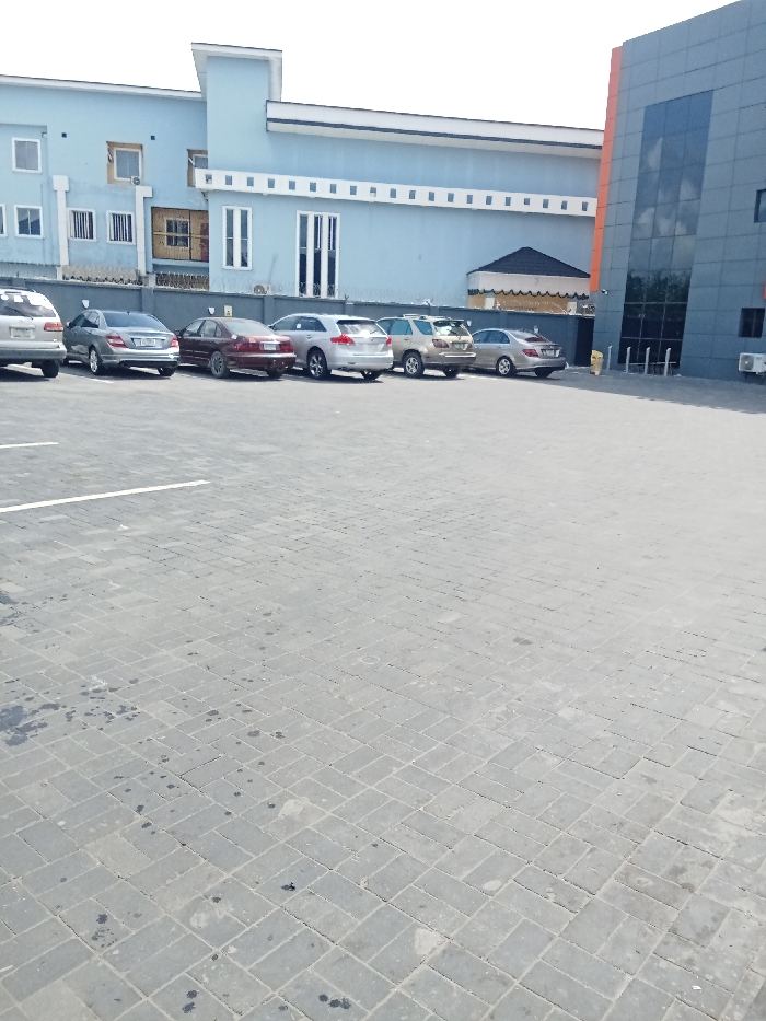 n empty parking lot with seven vehicles parked in a row. The parking lot is made of gray interlocking pavers and is in front of a two-story building with a light blue facade. There is a taller building to the right of the image. The taller building has a dark gray facade with large glass windows. The location, based on the provided coordinates, is Ujevwu, Nigeria.