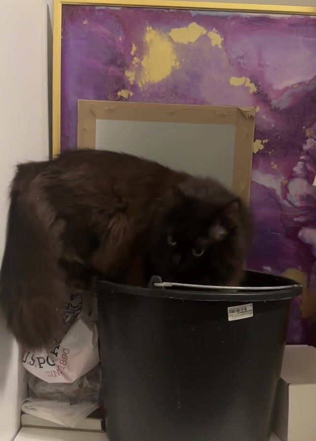 A dark-colored, long-haired cat is sitting inside a black plastic bucket. The bucket is sitting on a white surface next to some plastic bags and a white box. Behind the bucket and cat is a purple and gold painting, and a framed mirror. The cat looks down into the bucket, and then looks to the side.
