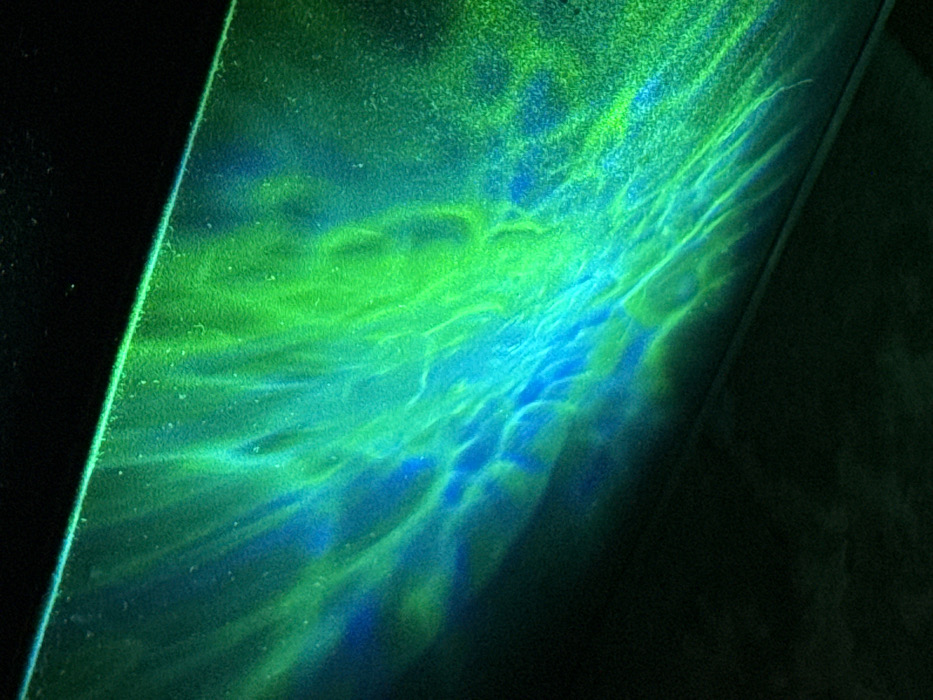 The image displays an abstract light projection on a textured, flat surface within a dark environment. The surface exhibits a granular or fine-speckled texture, angled from the lower-left to the upper-right of the frame. Dynamic light patterns, primarily in shades of vibrant green and deep blue, are cast upon this surface. The green hues are concentrated on the right and upper portions, blending into more defined, wave-like blue formations towards the left and lower-left. A sharp, dark linear boundary delineates the top edge of the illuminated surface, suggesting a physical edge or the limit of the projection area. The bottom and top sections of the image are dark, indicating an enclosed space. No individuals, identifiable objects, or specific actions are present. The provided information regarding the location in Kurganinsk, Russia, cannot be corroborated by visual evidence within the image.