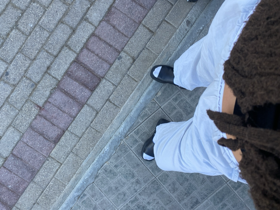 The image displays a high-angle view of a person's lower body standing on a paved surface in Skala, Greece. The individual is wearing light blue or white loose-fitting pants, black open-toed sandals, and white socks with a black stripe at the toe. A dark brown, textured, possibly knitted garment is visible in the foreground, partially obscuring the upper thighs. A white elastic band with visible "NNS" lettering is apparent at the waistband of the pants. The ground consists of two distinct paved sections: greyish-blue square tiles on the lower left, and grey rectangular pavers with a diagonal strip of reddish-brown rectangular pavers on the upper right. A worn, grey curb separates these two paving types, running diagonally across the mid-ground.