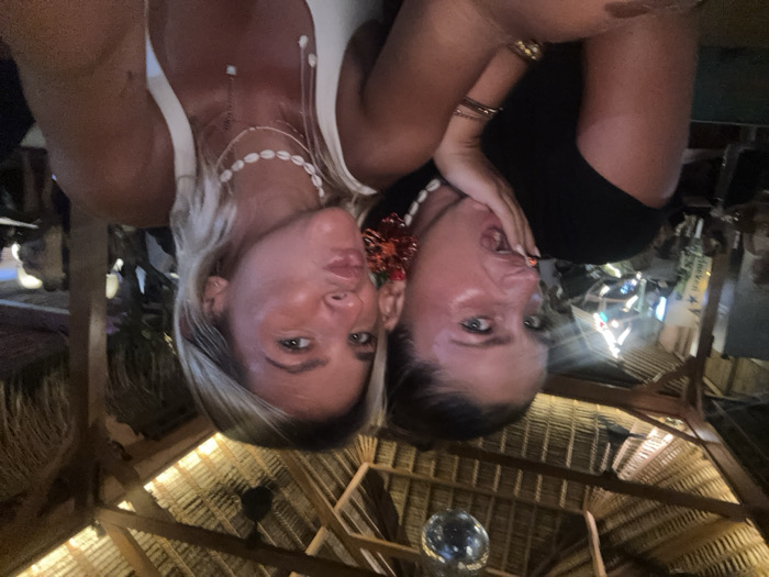 Two adult females are captured in a close-up photograph within an establishment in Uluwatu, Indonesia. The setting features a thatched roof supported by wooden beams, with a disco ball suspended from the ceiling. Dim artificial lighting illuminates the scene, consistent with an evening bar or restaurant environment, where other patrons and a partially visible Heineken sign are discernible in the background. The woman on the left, with dark hair pulled back, wears a dark-colored top and large, reddish, possibly shell-like earrings; she has an open-mouthed expression, with her right hand touching her chin, and wears a necklace of white shells along with bracelets. The woman on the right, with blonde hair, wears a light-colored, possibly white sleeveless top, and multiple necklaces, including one composed of white shells, while posing with a "kissing" expression.