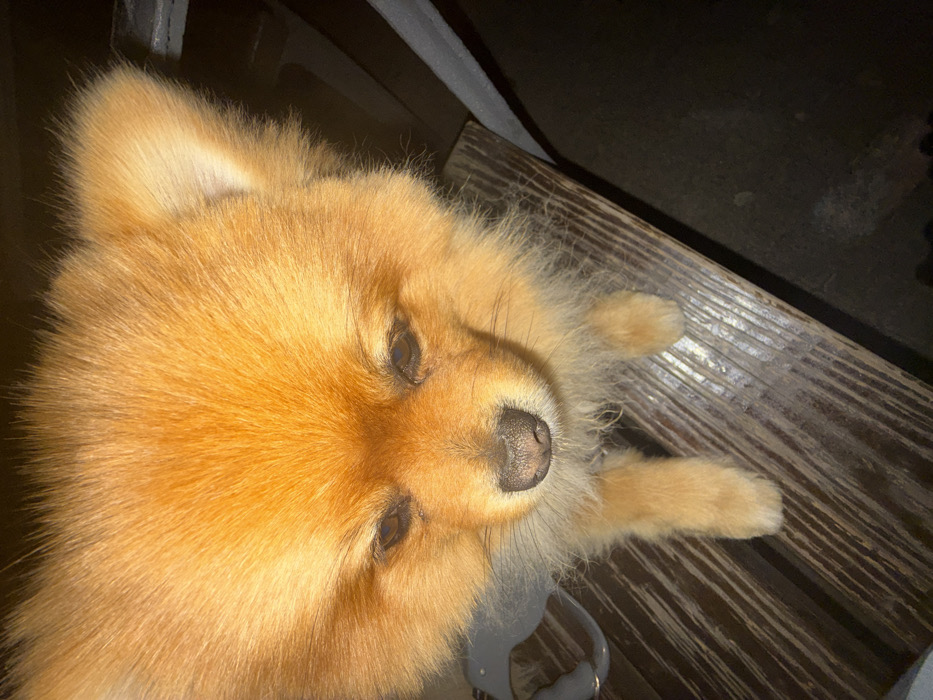 - "The image displays a high-angle view of a Pomeranian dog standing on a wooden surface" by FM-L8M0m1, licensed under CC BY 4.0