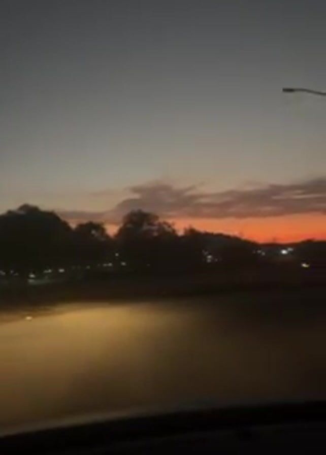 view from inside a car driving on a road at dusk. The sky is a gradient of gray to orange. Silhouetted trees line the side of the road. In the distance, a triangular mountain is visible against the orange sky. Streetlights are seen on the side of the road. The car's headlights illuminate the road.