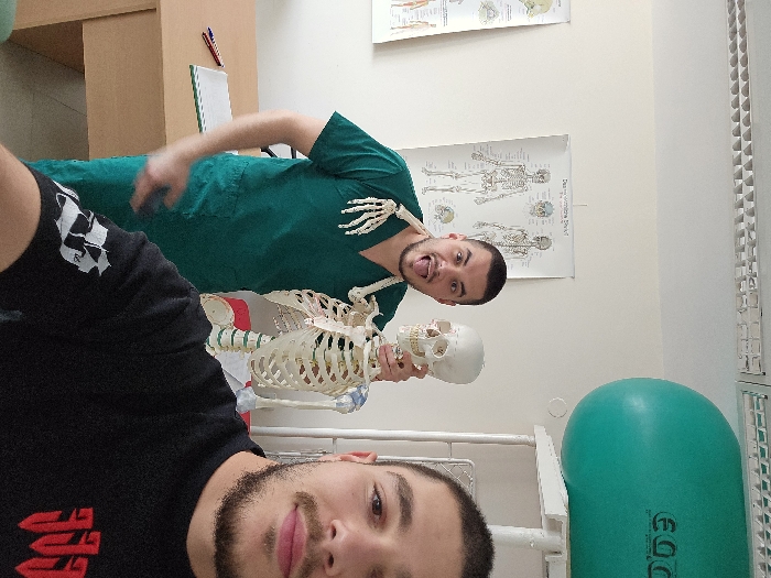 An indoor photograph depicts two young adult males in what appears to be an anatomy lab or physiotherapy room, likely within a medical educational institution in Pleven, Bulgaria
