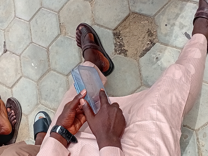 The image depicts an overhead view of three individuals seated on hexagonal concrete pavement in Kwazailewa, Nigeria. In the foreground, a person wearing a light pink or beige patterned traditional garment and dark brown leather sandals holds a transparent rectangular electronic device with both hands. A black-strapped wristwatch is visible on their left wrist. To the upper left, the feet of a second person are visible, wearing dark brown sandals. Slightly below them, the feet of a third person are visible, wearing black slides. The concrete pavement exhibits wear, with one hexagonal section in the center revealing exposed earth and debris.