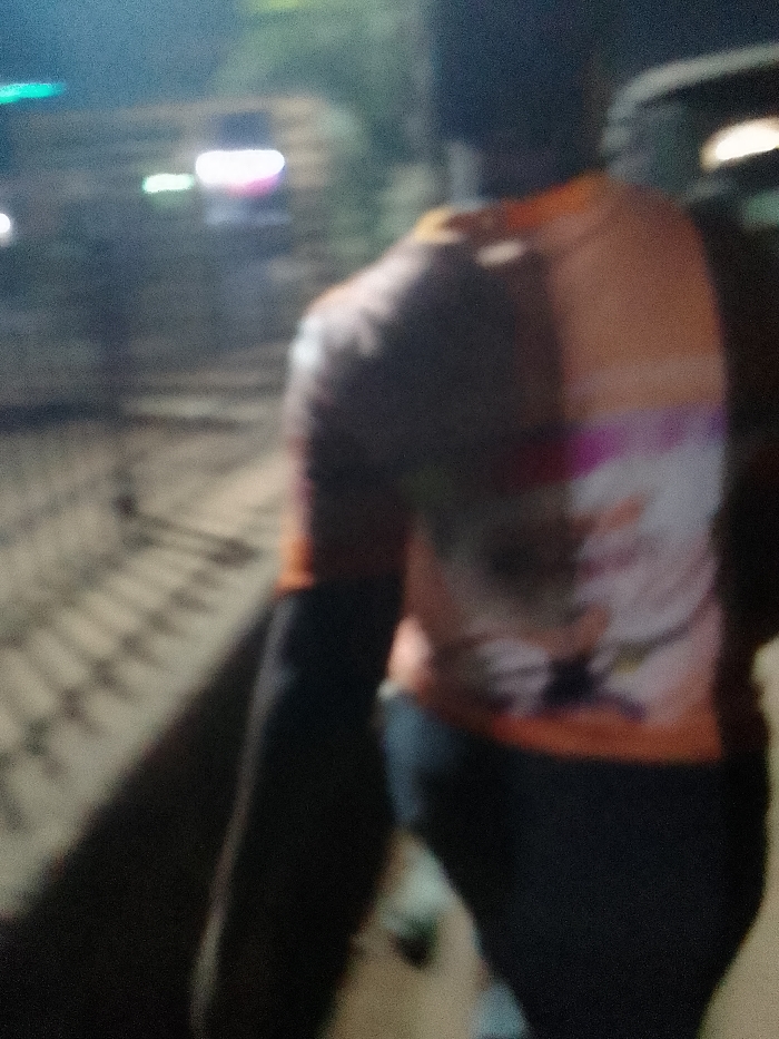 A blurry image shows a person from the back. They wear an orange and white t-shirt with a floral design, black sleeves, and dark pants. The background includes a dimly lit street with a sidewalk or concrete barrier. Unidentifiable objects with lights are visible in the distance, suggesting an urban setting at night. A portion of a vehicle is to the right. The overall scene is indistinct and low-resolution.