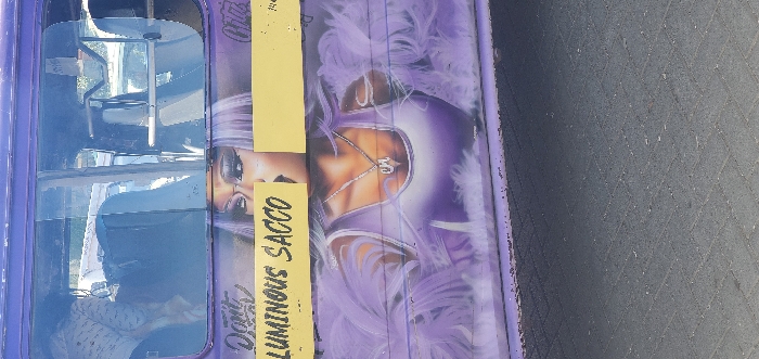 The image displays a section of a custom painted vehicle roof with a purple base. The artwork includes a woman's face and torso, adorned with feathery details. A sticker displaying the text "Don't Luminous Sacco" is vertically placed. A portion of the vehicle's windshield and the driver's side interior are also visible. The vehicle is parked on an asphalt surface.