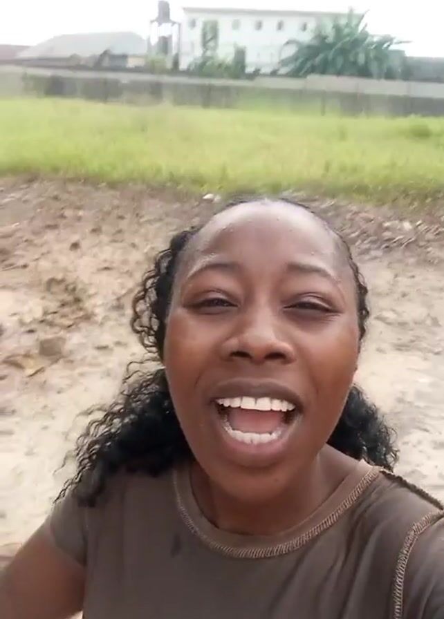 A woman stands outdoors, filming a selfie video. She is wearing a brown t-shirt and has dark curly hair pulled back from her face. Behind her is a grassy area, some sparse trees, and a building in the background. The ground appears to be dirt and dry leaves. She is smiling and singing with enthusiasm. She raises her hand towards her ear. The lighting suggests it is daytime, but possibly overcast.