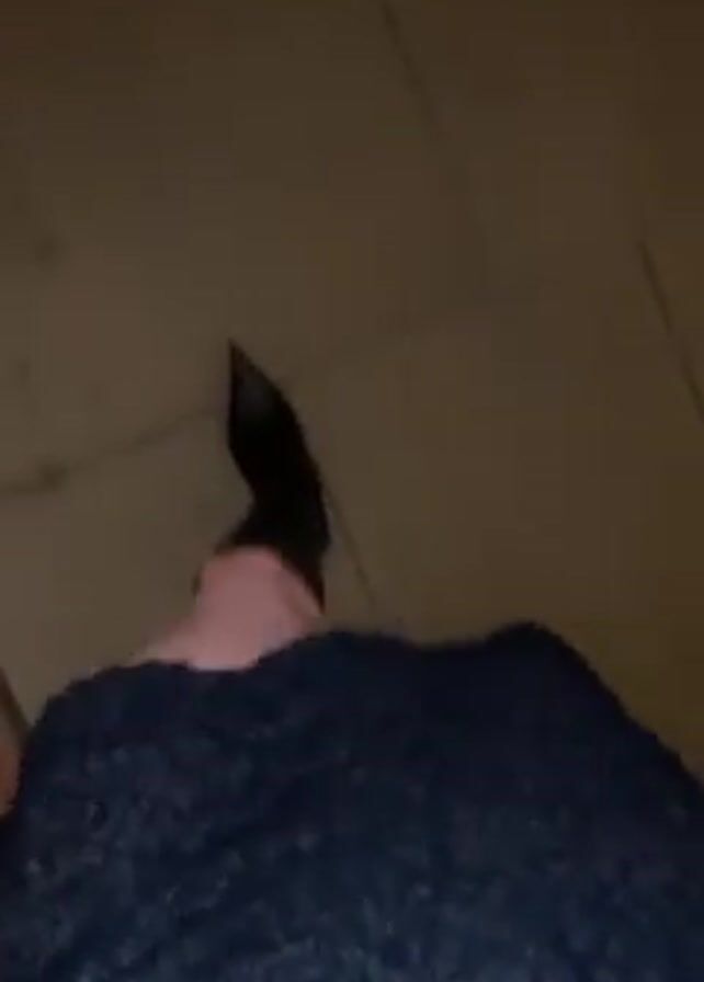 A woman wearing a short dark blue sweater or dress and black pointed-toe boots walks on tiled flooring. The woman is later seen from the back with her face visible, wearing a red dress with an open back. She has blonde shoulder-length hair and is holding a black smartphone. The background appears to be indoors with warm lighting and some decorative elements. The woman waves briefly at the camera.