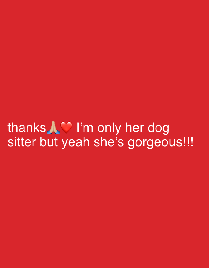 This digital image presents white text and two emojis against a uniform red background. The text, positioned in the lower-left quadrant, states: "thanks 🙏❤️ I'm only her dog sitter but yeah she's gorgeous!!!". A folded hands emoji (🙏) is present immediately after the word "thanks", followed by a red heart emoji (❤️). The scene provides no visual information regarding a specific geographic location, individuals, physical objects beyond the digital text and emojis, or depicted actions or interactions.