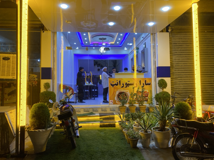 An entrance to a restaurant called "Sara Restaurant" in Urdu