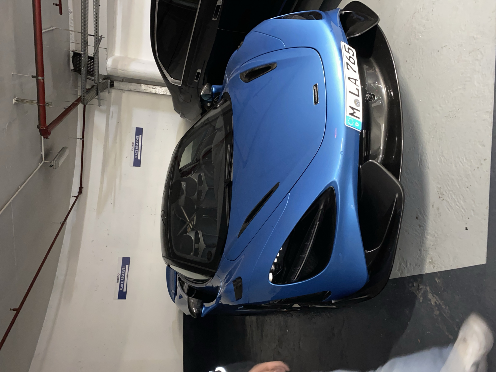 blue McLaren 765 parked in an indoor parking garage. Next to it is a black car, partially visible. The parking spot is marked with a sign in French reading "INDIGO PLACE RÉSERVÉE". The license plate on the McLaren reads "M LA 765". The location appears to be in Paris, France, based on the French sign. There is a person partially visible at the bottom right corner of the image. There are also some pipes in the upper left corner of the image.