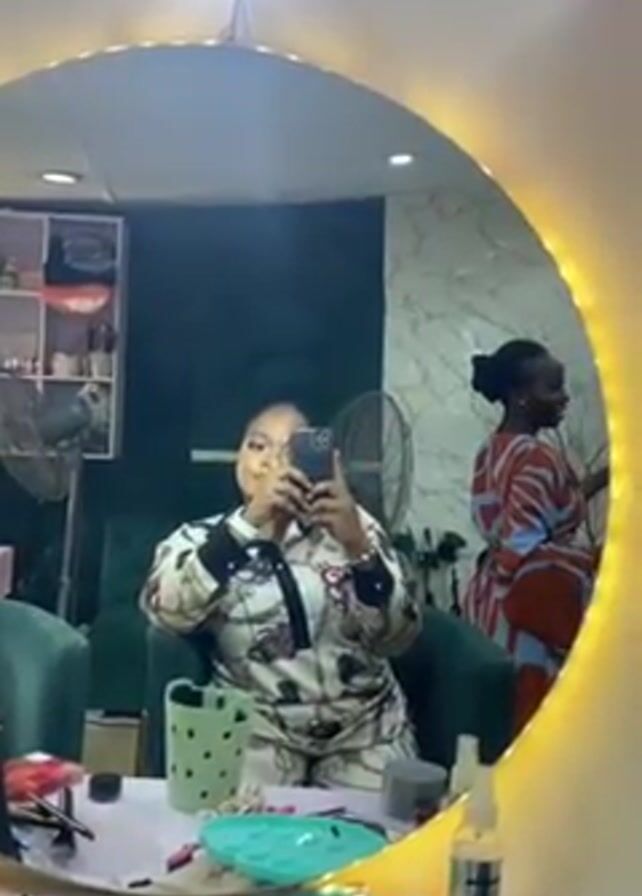 A woman in a cream and black patterned pantsuit is taking a selfie in a mirror inside of a room. A light-ringed circular mirror illuminates the scene. There is another woman in the background, who is wearing a multicolored, geometric patterned dress and a head covering. Both women are Black. The woman in the mirror is seated in a teal chair, and in front of her is a table covered in makeup and beauty supplies. There is a shelf of products behind her, and an electric fan is in the corner of the room. The other woman in the background is standing and appears to be getting dressed.