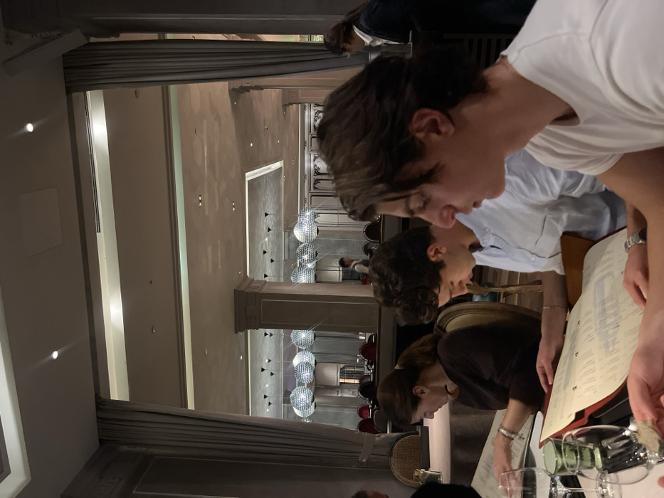 The image captures an interior view of Mr. & Mrs. Bund, a restaurant located in Shanghai, China, depicting diners at a table in a dimly lit, upscale setting. In the foreground, from right to left, three individuals are seated, each focused on an open, red-bound menu. The person furthest right is a young male with dark, medium-length hair, wearing a white t-shirt, with his left hand resting on the menu, revealing a wrist watch. Next to him, a young male with curly dark hair wears a light blue button-up shirt, also looking down at his menu. To the left, a female with dark hair tied in a ponytail, wearing a dark brown long-sleeved top, reads her menu, with her right hand visible. On the white-tablecloth-covered table, multiple wine glasses, other drinking glasses (one with a green tint), and a small piece of bread are visible. The foreground seating includes a chair with a wicker backrest. Beyond the immediate dining area, a large, ornate archway framed by heavy grey drapes opens into an adjacent, brighter dining room. This room features high ceilings with recessed lighting and numerous large, spherical, mirrored pendant lights hanging in rows. Ornate pillars and decorative wall moldings are visible. Tables with red upholstered chairs are arranged in the background. A male staff member in a white shirt and dark vest walks in the distant background, while a female staff member in a dark uniform is partially visible on the far right. The overall environment suggests a luxurious and modern dining establishment.