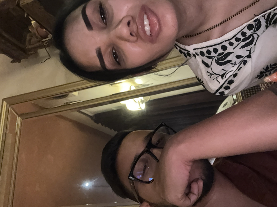 The image depicts two individuals, a male and a female, positioned for a close-up photograph within an indoor setting in Howrah, India. **People:** A male subject occupies the left side of the frame, partially obscured. He wears dark-rimmed glasses and a reddish-brown garment, with his right hand resting against his chin. His facial hair includes a beard. His eyes are visible through the glasses. A female subject is centrally and to the right, facing the camera directly. She has dark hair, distinct eyebrows, and her mouth is slightly open, revealing both upper and lower teeth. She wears a white V-neck garment adorned with black embroidered patterns, and a thin dark necklace. **Objects and Environment:** The background features a large, ornate mirror with a gold-colored frame, prominently reflecting portions of the room. Reflected in the mirror are a wall-mounted light fixture emitting warm, yellow light, and dark curtains. Above the mirror's reflected area, in the upper right, a segment of a carved decorative object, possibly wood or metal, is visible. The lighting is dim and artificial, contributing to an intimate or evening ambiance. The decor suggests an establishment such as a restaurant, hotel, or a private residence. No specific street-level or landmark identifiers within Howrah are discernible.