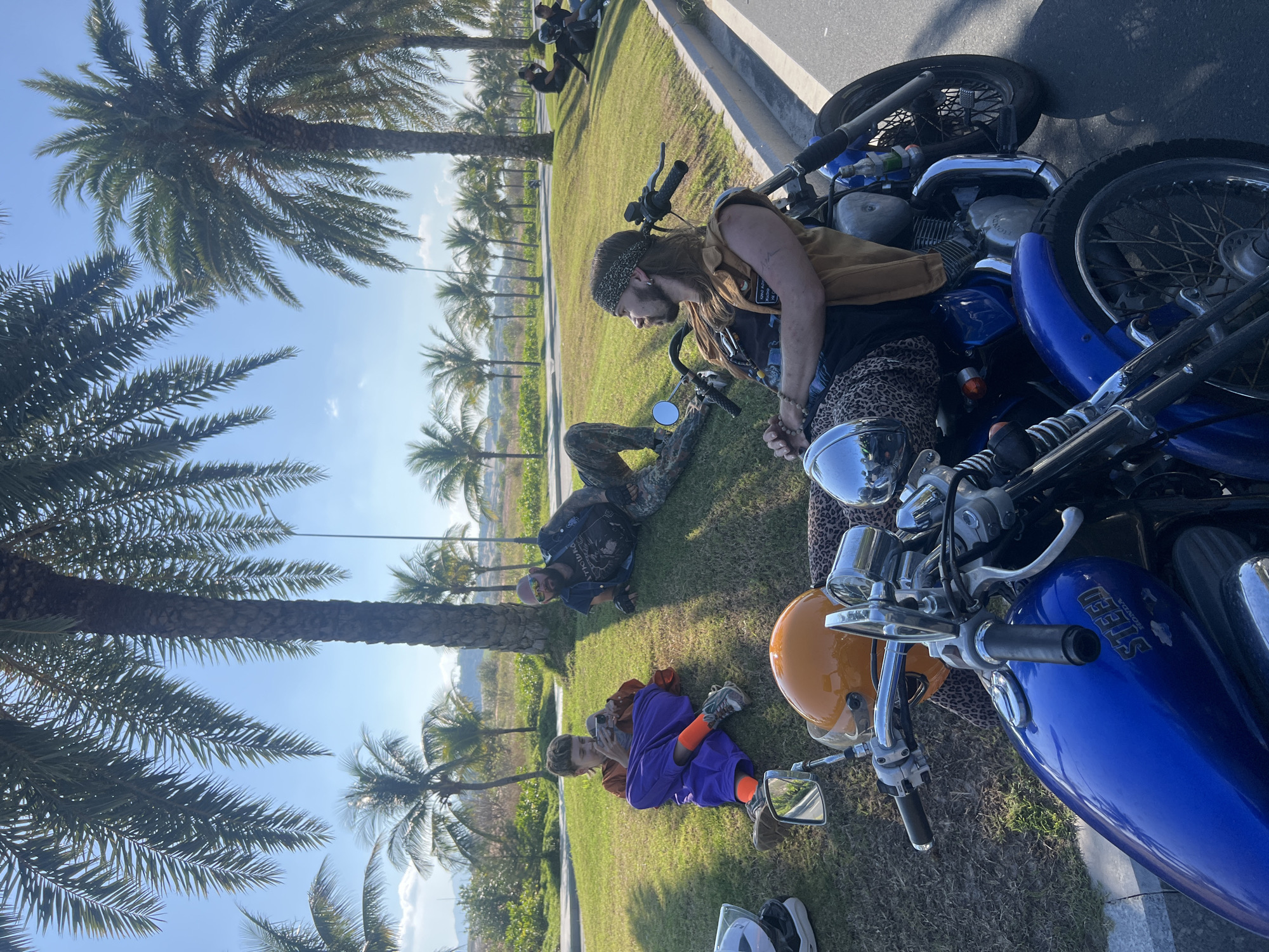 An outdoor scene in Cam Ranh, Vietnam, depicts a group of individuals resting on a sunny day alongside a paved road, beneath tall palm trees. In the foreground, two custom-style motorcycles are parked. The closest motorcycle has a bright blue fuel tank with "STEED" and "HONDA" visible, chrome handlebars, and a blue front fender. An orange full-face helmet rests on its handlebars. Behind it, a man with long hair, a beard, and a bandana sits on a blue motorcycle, clad in a light brown sleeveless vest over a dark t-shirt and leopard-print pants, looking towards his left. To his left, on the green grass, a younger individual with short hair wears an orange long-sleeved shirt, purple pants, and orange socks, reclining while actively looking at a white smartphone held horizontally. A white open-face helmet is on the grass near their feet. Further to the right, another man with a shaved head, beard, and sunglasses lies on his back on the grass, wearing a dark graphic t-shirt, camouflage pants, and fingerless gloves, looking towards the camera. In the distant background, several indistinct figures are also visible resting on the grass, further along the road. The immediate area is well-maintained green grass, bordered by the paved road. Numerous palm trees line the road, casting shadows. The sky is clear blue with minimal clouds. Distant hills are visible on the horizon.