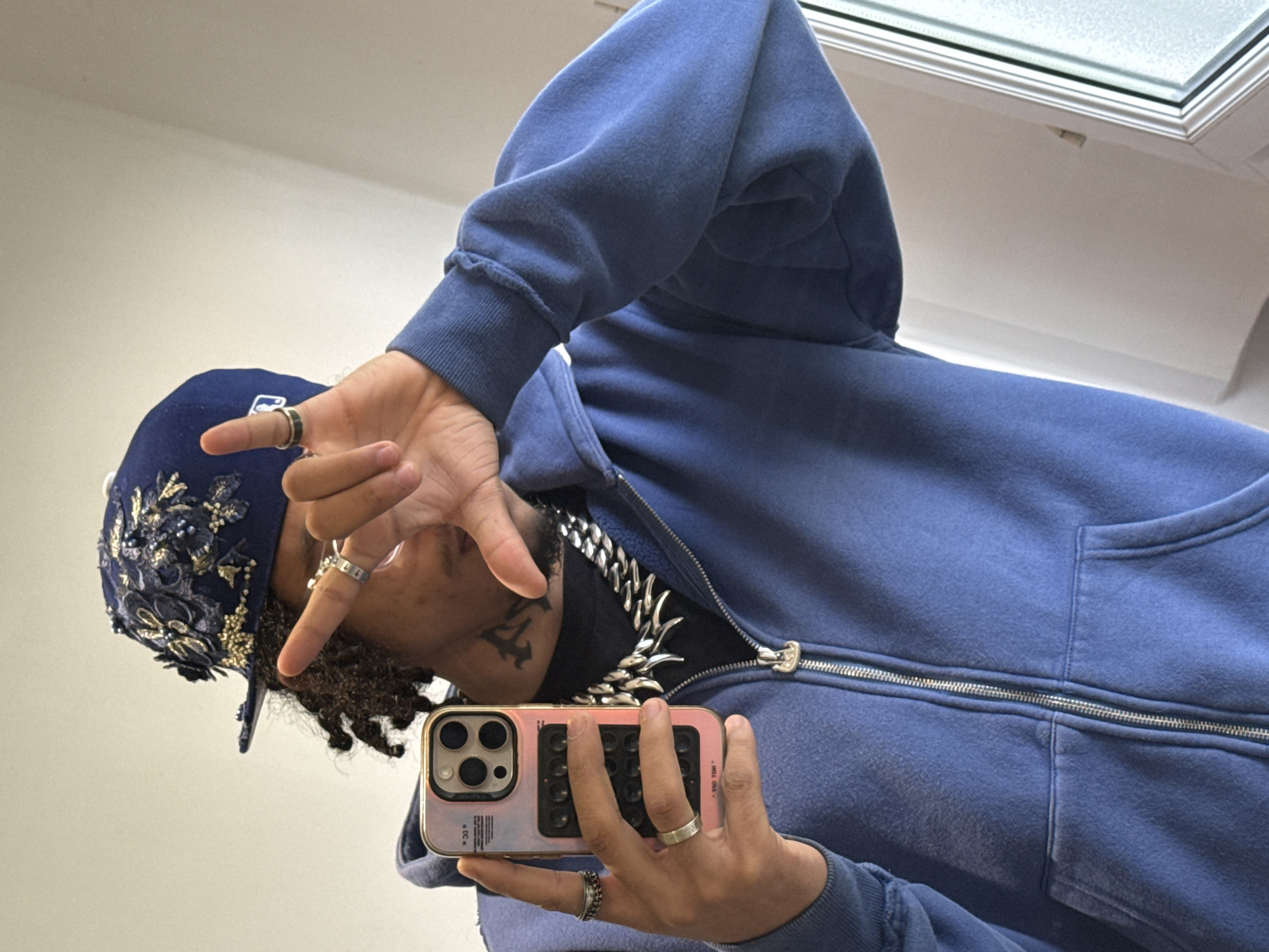 A medium shot depicts a person with dark curly hair wearing a navy blue baseball cap adorned with floral embroidery, a blue hoodie, and a silver chain, taking a selfie with an iPhone. The person is wearing multiple rings on their fingers. The selfie is being taken in what appears to be an indoor space with a white wall and a skylight visible in the background. There's no explicit evidence that the scene is located in Massy, France, so the location is undetermined based on the image alone. The person's face is partially obscured by their hand gesture. A tattoo is visible on their neck.