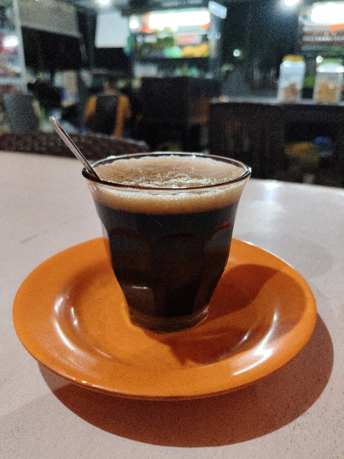 The image displays a clear, faceted glass filled with a dark brown liquid topped by a light brown foam layer, approximately 0.5 cm thick. A silver-colored metal spoon is partially submerged within the glass, resting against its rim. The glass is positioned centrally on a round, orange ceramic saucer, both situated on a smooth, light-colored tabletop. A distinct, dark shadow of the glass and saucer is cast on the tabletop to the right, indicating a light source from the left. The background, significantly out of focus, reveals an indoor commercial establishment within the city of Cut, Indonesia. Visible elements include dark, rectangular structures resembling counters or tables, illuminated by multiple bright overhead artificial lights. On a counter to the right, two tall, clear jars containing light-colored granular material are discernible. Towards the left background, the blurred figure of an individual is observed from behind, wearing a yellow upper garment. The scene is illuminated by artificial light, consistent with an evening or indoor setting.