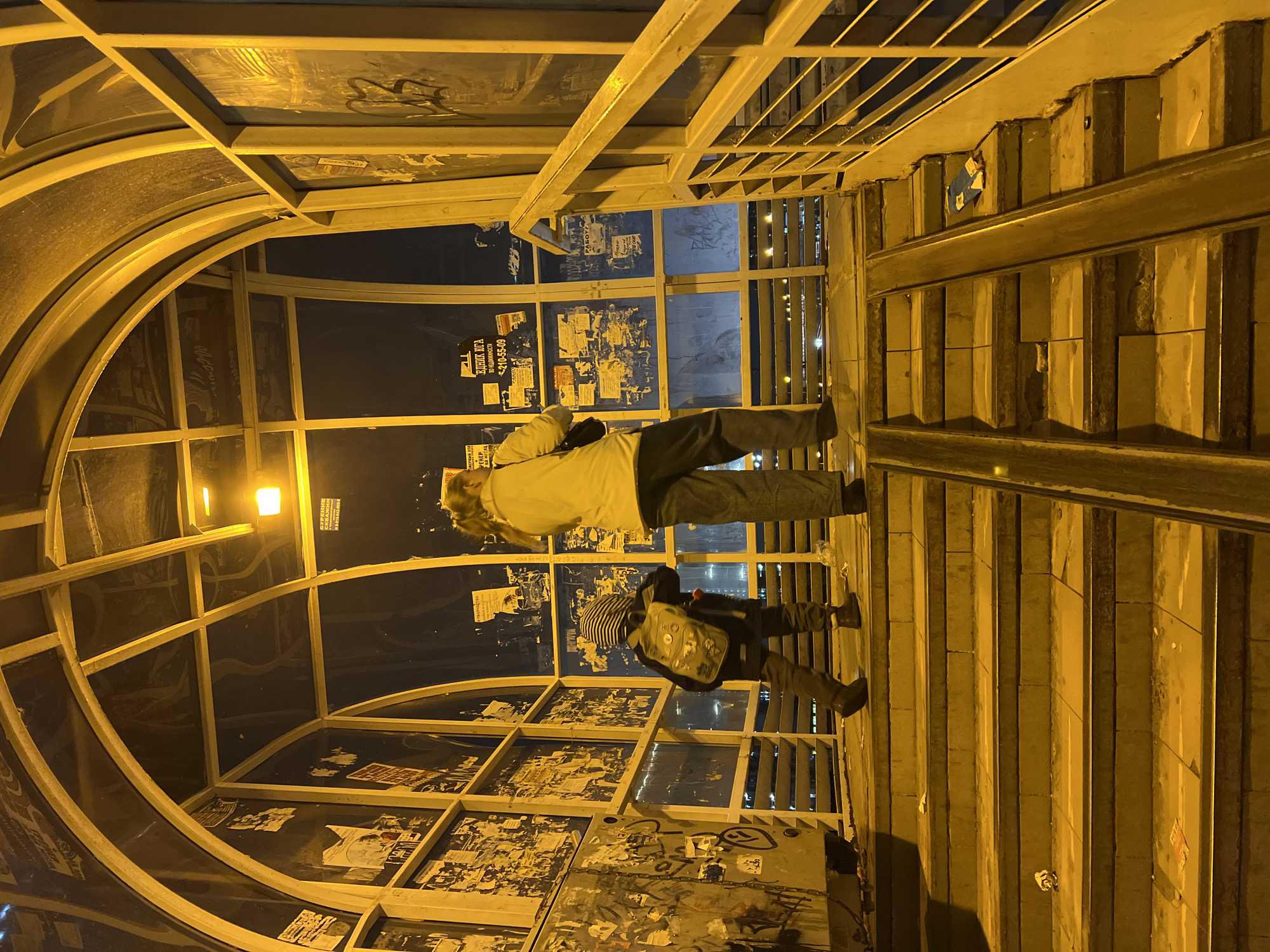 Two individuals are ascending a stairwell enclosed within a metallic structure with arched, windowed walls. The walls are covered with posters and graffiti. One person is wearing a light-colored jacket and dark pants, while the other is wearing a hooded striped top, dark pants, and carrying a backpack. The scene appears to be at night, illuminated by warm-toned lighting. The location is Unknown, Unknown.