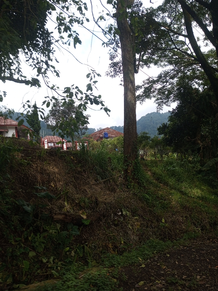 The image captures a verdant, semi-hilly landscape within Daringbadi, India. The immediate foreground consists of a dark dirt path on the lower right, transitioning into a steep, earthen embankment that dominates the left and center. This embankment is covered with a dense layer of dry, matted brown grass, intermixed with various green broadleaf plants, and contains a visible decaying log. A prominent, large tree with a thick, rough brown trunk stands centrally, rooted in the embankment, its canopy extending into the upper frame and obscuring parts of the sky. In the background, positioned on a slightly higher elevation, are multiple structures featuring white walls and red-tiled roofs. One building on the right side of the frame distinctly shows a blue cylindrical water tank situated on its roof. To the left, another tall, slender evergreen tree is visible between buildings. Beyond these man-made structures, heavily forested green hills rise in the distance, under an overcast, bright sky. No human figures or discernible actions are present in the scene.