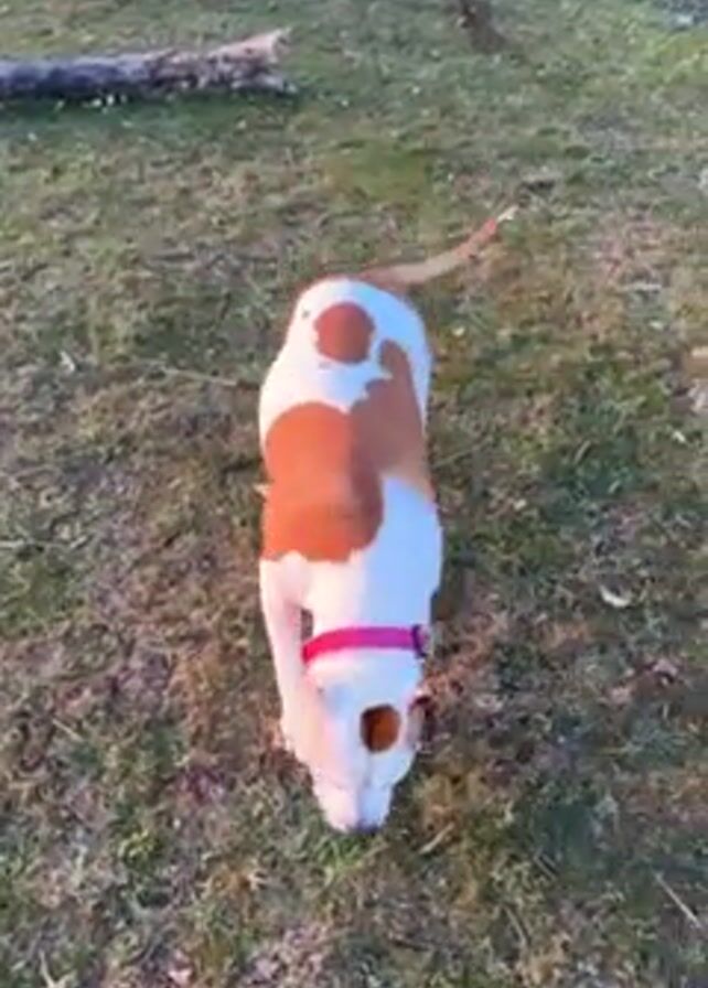 A white and brown dog wearing a pink collar sniffs the ground in a grassy field