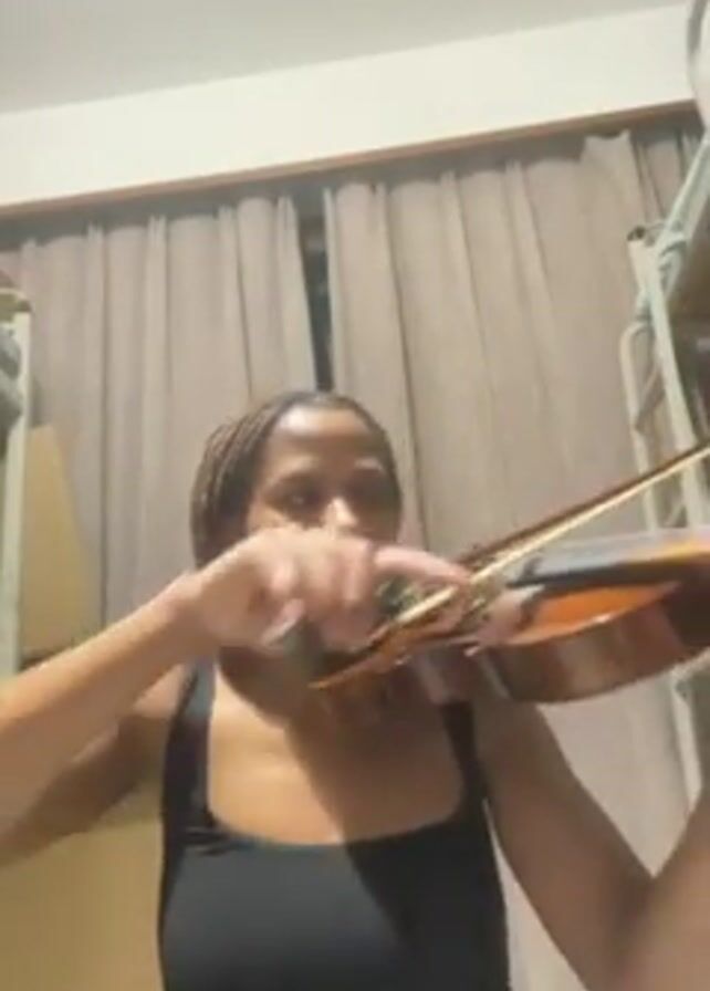 A woman with braided hair plays a violin. She is wearing a black tank top. The background includes a beige curtain and what appears to be a bunk bed or shelving unit. The lighting is somewhat dim and artificial. She is looking forward while playing.
