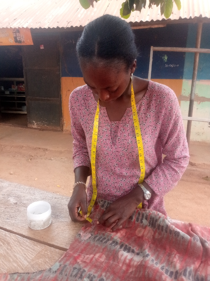 An individual with dark skin and dark hair pulled back is depicted in an outdoor or semi-outdoor workspace, location in the city of Unknown, Unknown. The person wears a pink long-sleeved shirt with a subtle floral pattern. A yellow fabric measuring tape is draped around their neck. A light-colored beaded bracelet adorns their left wrist, and a silver-toned wristwatch is on their right wrist. The individual is leaning forward, focused downwards, using both hands to measure a piece of red, white, and dark-patterned fabric with the measuring tape. The fabric rests on a light-brown wooden surface. To the left of the person's hands on this surface, a small, translucent white plastic container with a lid holds multiple metallic pins or needles. The background features a building with a rusted corrugated metal roof. The building's wall exhibits horizontal bands of paint, including dark blue/green and orange/brown. An orange sign with partial white text is visible on the far left wall, above a dark door or shutter. A wooden frame structure stands on the right side of the background. The ground is exposed light-brown earth. Green foliage is visible at the top of the image frame.