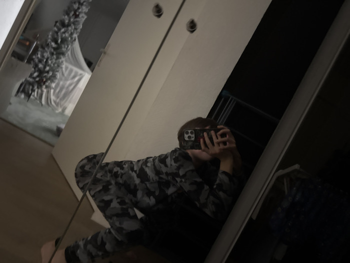 A reflection in a tall mirror shows a person taking a selfie. They are wearing camouflage-patterned pajamas. The reflection reveals a room behind them, with a Christmas tree and bed visible. The rest of the reflection shows a dark interior. The person is positioned low, with only legs and upper torso visible. Their face is obscured by the phone.