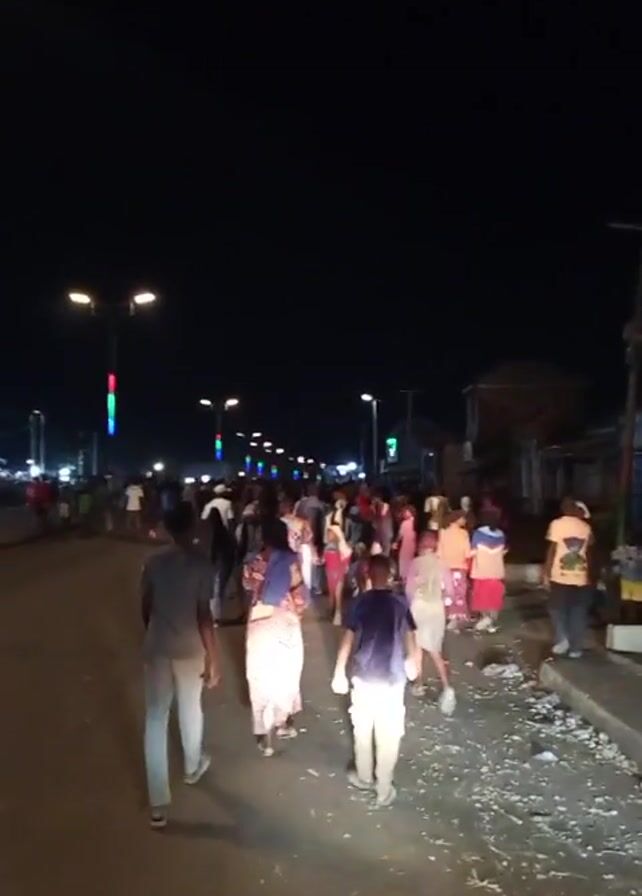 At night, a crowd of people walks down a street illuminated by streetlights. The streetlights are spaced along the road, with one standing taller and displaying colored lights. Most people are walking, but some are running. The street appears to be dirty with debris. Buildings and structures can be seen on the right side of the road. The sky is dark and clear.