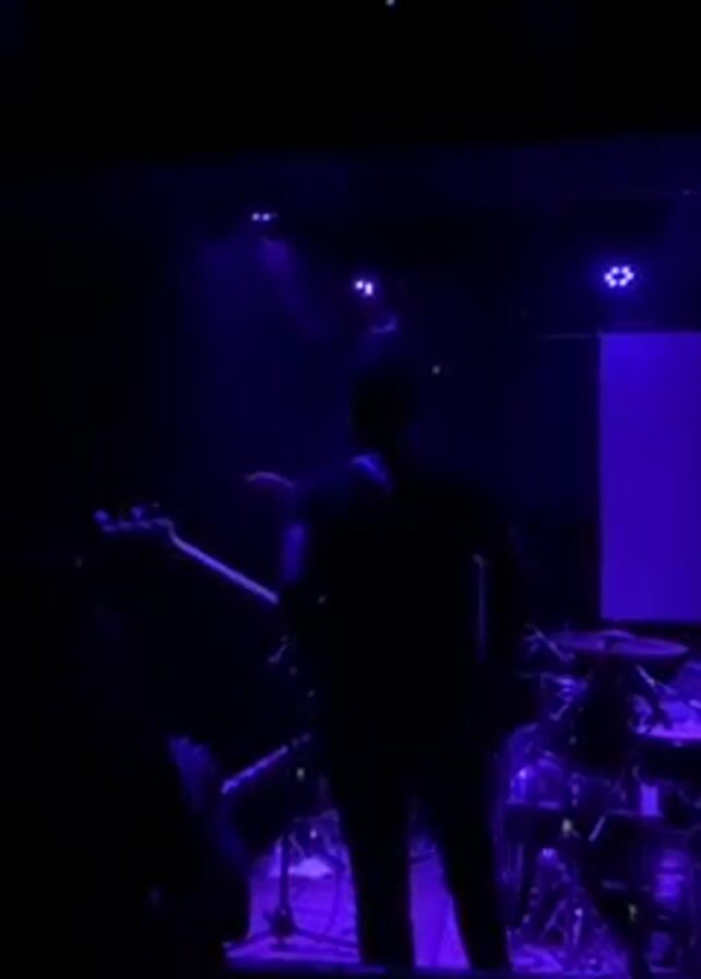 A dark stage bathed in blue light. A silhouette of a band member stands center stage, facing the audience. To the left, a guitar is visible, while to the right, a drum set is present. Another band member stands near the guitar. The overall scene is dim.