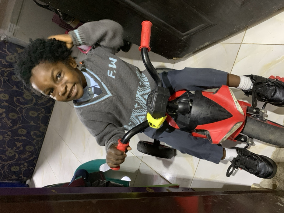 A young boy, wearing a grey sweater with a light blue trim, a light blue shirt, and grey trousers, sits on a small red and black tricycle. He smiles at the camera, holding the red handlebar grips. His feet, clad in black shoes and white socks, rest on the pedals. The tricycle has a yellow and black plastic piece at the front. A dark wooden door is visible in the background, along with a tile floor and patterned furniture.