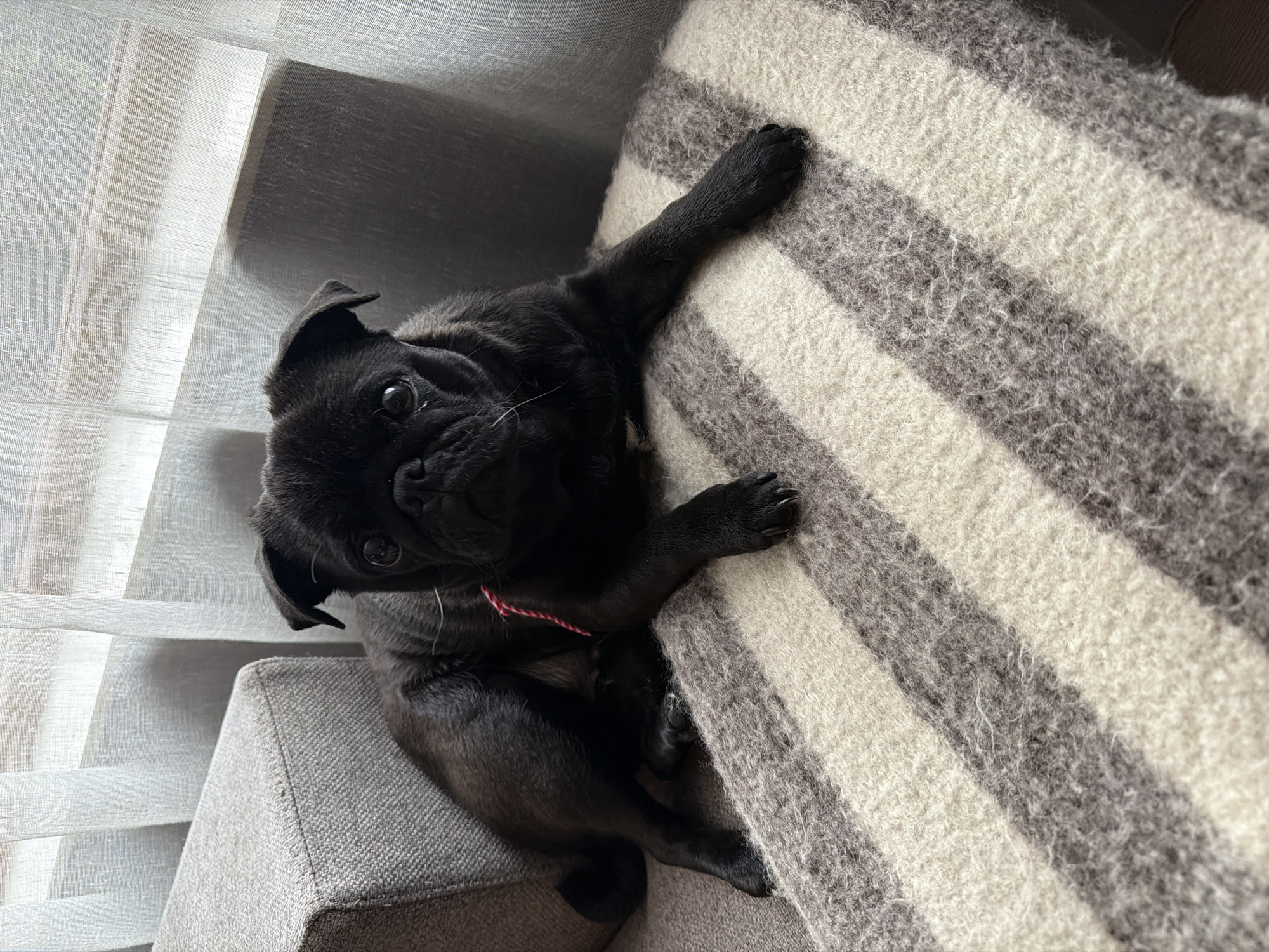 An indoor scene in the city of Razlog, Bulgaria, features a black pug dog lying on a striped blanket. The pug, with black fur, a wrinkled face, large dark eyes, and visible white whiskers, is positioned on its stomach with front paws extended and hind legs tucked, looking directly towards the viewer. A thin red braided string or collar is visible around its neck. The blanket underneath is made of thick, fuzzy material, displaying alternating horizontal stripes of light cream and gray. To the left, a portion of a gray, textured upholstered sofa or armchair is present. The background shows a window covered by light-colored, sheer, textured curtains, allowing diffused light into the room.