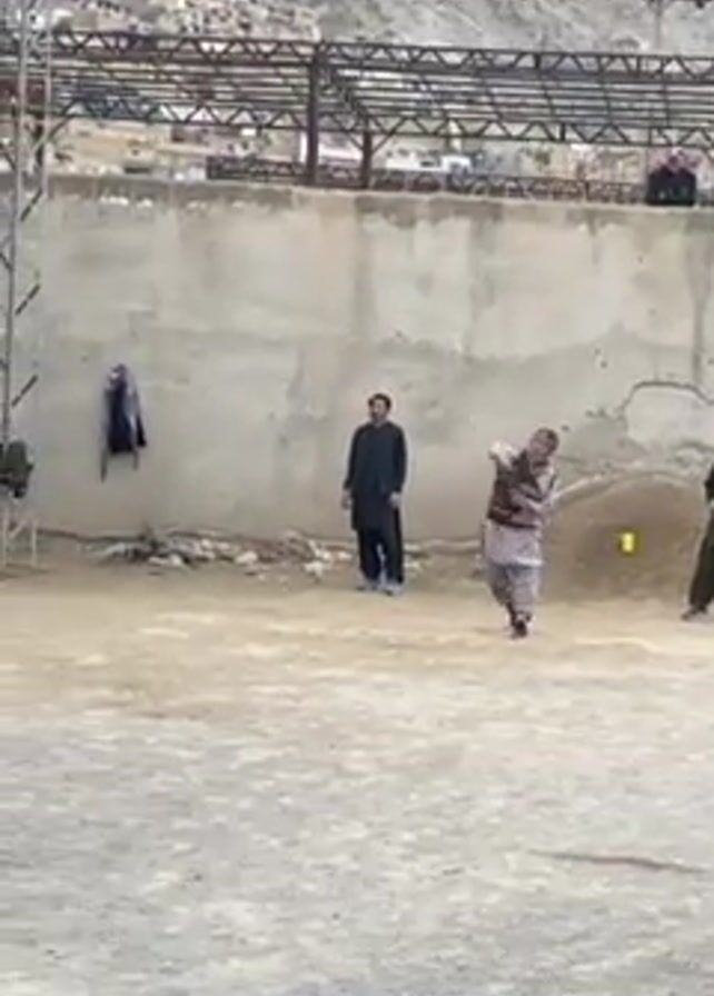 group of men playing boules in a dirt-covered area surrounded by a wall and a tiered seating structure under a metal roof. A mountain is visible in the background. One man throws a boule, while others watch, walk around, or sit on the tiered seating. Some men are wearing traditional clothing, while others wear more modern attire. The scene appears to be outdoors, with overcast weather conditions. The ground is uneven, and there are some objects scattered around the playing area.