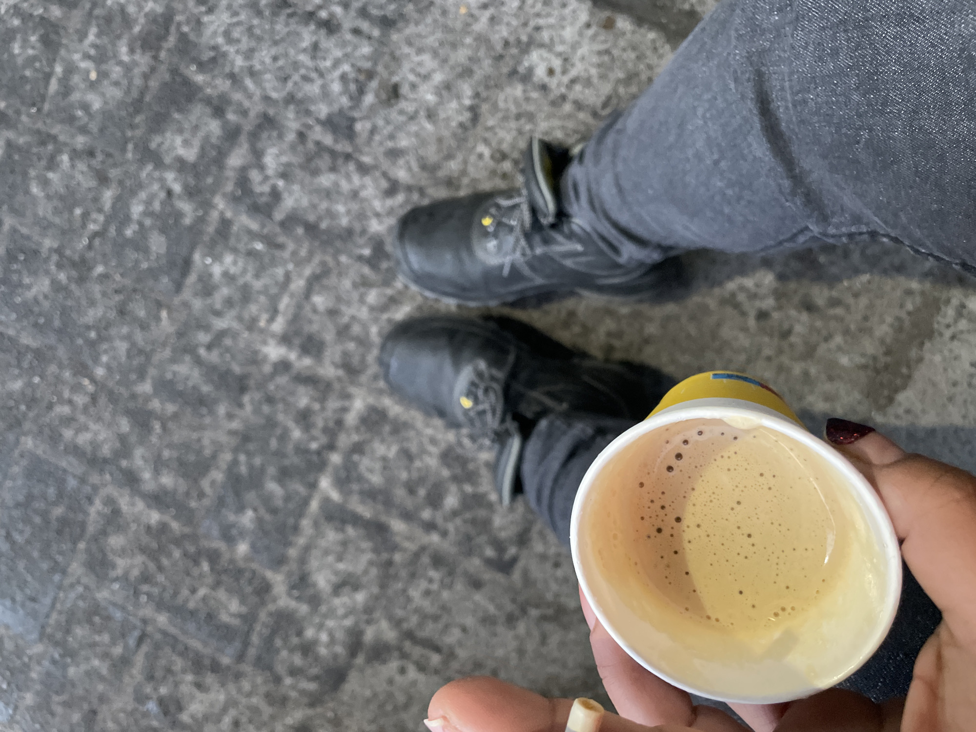 The image presents a first-person, downward perspective of an individual's lower extremities and hands on a paved surface in Kampen, Netherlands. The subject is wearing dark grey or black slim-fit jeans and black laced boots with visible yellow accents near the lacing. In the foreground, a hand, exhibiting dark red nail polish on one visible fingernail, holds a small white paper cup with a yellow base. The cup contains a light brown beverage displaying crema and small bubbles, consistent with coffee. Adjacent to this hand, a thumb and index finger are visible, gripping a short, cylindrical, light-colored object, consistent with a rolled cigarette or a filter tip. The ground surface is a dark grey, textured pavement, composed of irregularly shaped stones or tiles, which is out of focus.
