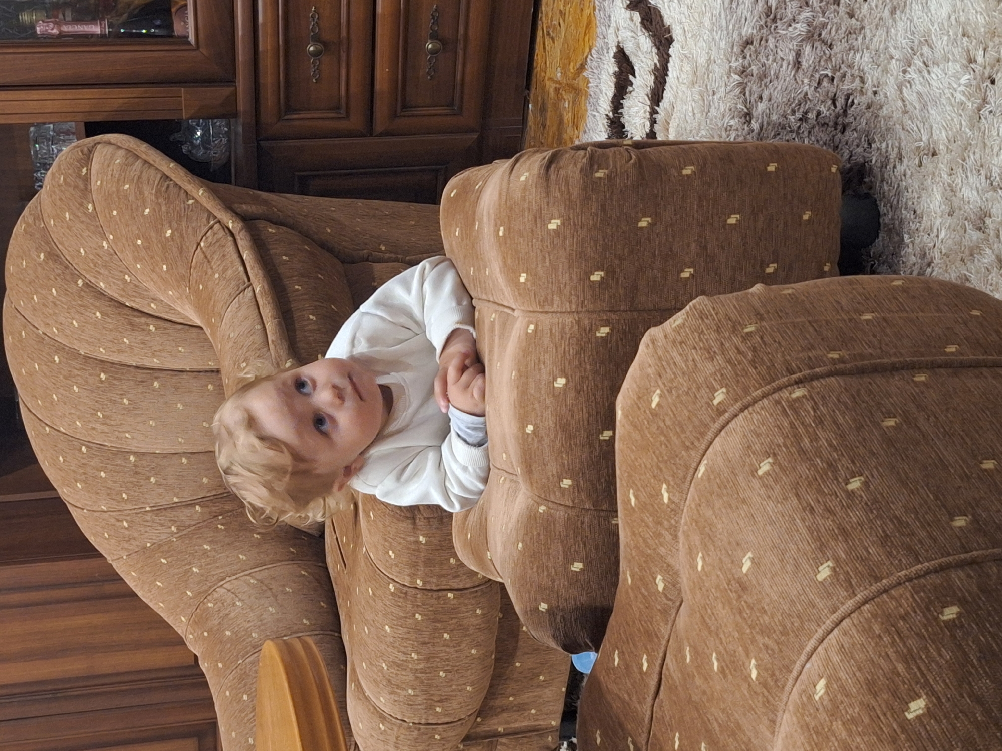 An infant with light, curly hair and blue eyes, wearing a white long-sleeved shirt with gray cuffs, is depicted in an indoor residential setting in Simitli, Bulgaria. The infant is positioned with forearms resting on a light brown upholstered ottoman, which features a pattern of small, light-colored square dots. The infant's gaze is directed upwards and to the right of the frame. Behind the infant is a matching upholstered armchair or sofa section. To the left, a portion of a round wooden side table is visible. To the right, a dark brown wooden cabinet with glass-fronted upper sections displays a crystal bowl and a bottle, while lower sections contain drawers with metal pull handles. The floor beneath the furniture is covered by a patterned rug with white and brown elements.
