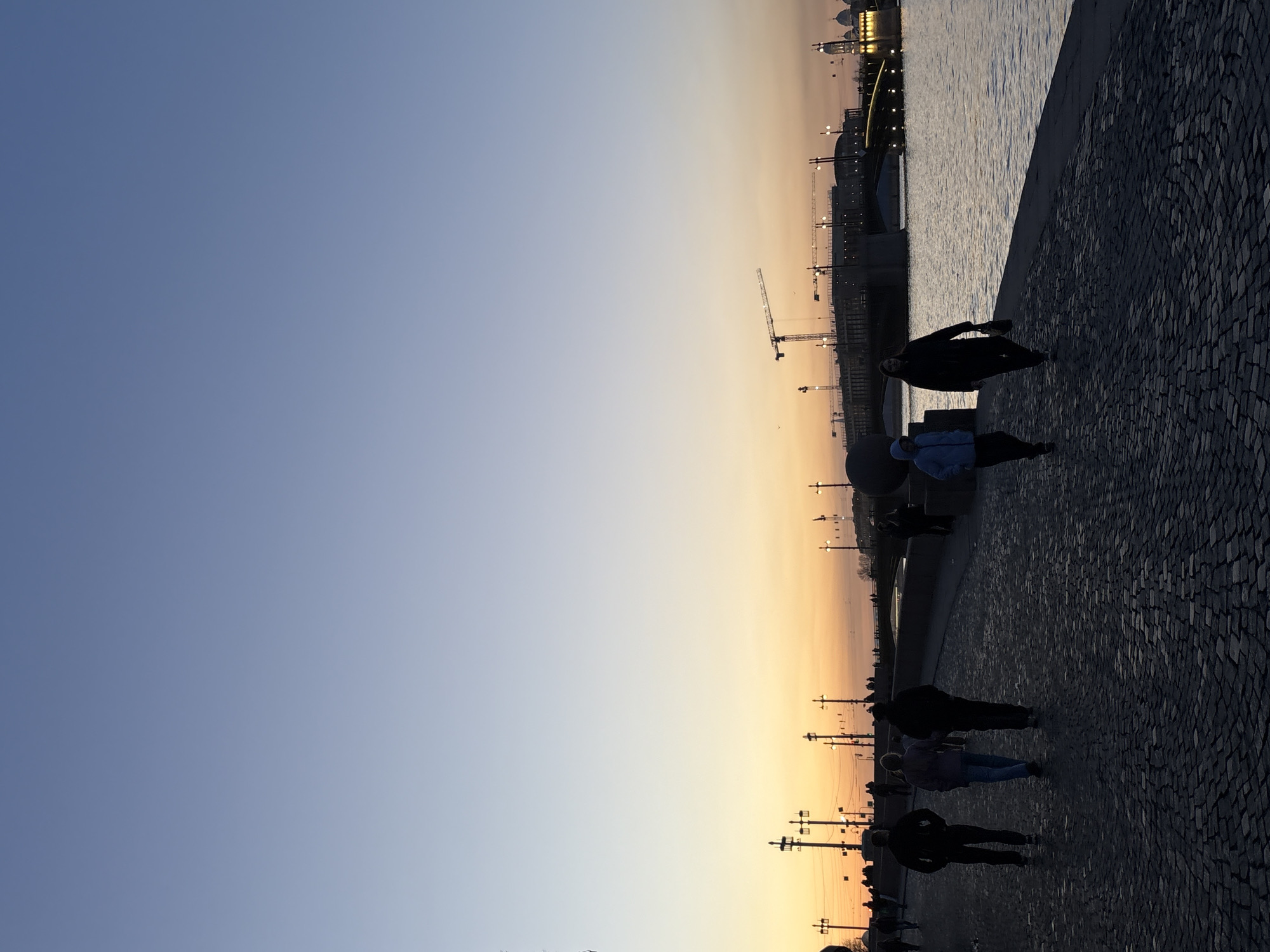 The image depicts a scene along a waterside promenade in Unknown, Unknown, at dusk. The sky transitions from a deep blue to a warm orange hue on the horizon. Silhouetted figures of people are walking along a cobbled path adjacent to the water. In the distance, cranes and building structures suggest a city skyline under construction. Overhead street lamps line the path, adding to the urban environment. The water is still and reflects the sky's colors.