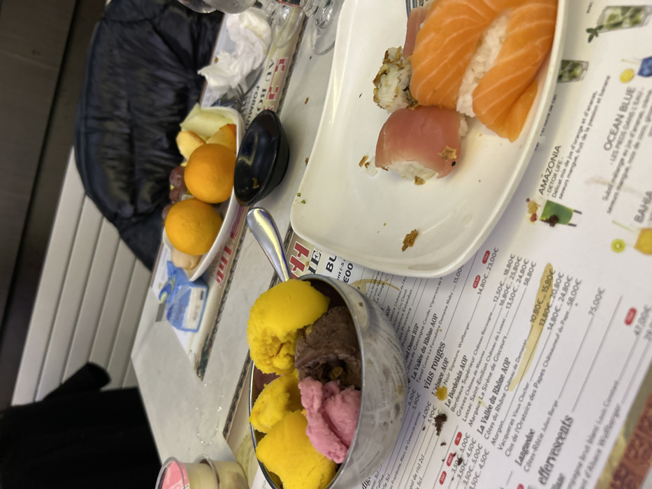 A tabletop scene presents a partially consumed meal. A white plate holds sushi pieces, including salmon and tuna. A metal container brims with multi-colored scoops of ice cream. A fruit bowl with oranges and other fruits sits nearby. A menu card displays prices for various drinks and dishes, featuring wines and other beverages like "Ocean Blue" and "Amazonia," suggesting a restaurant setting. A black jacket is visible in the background.