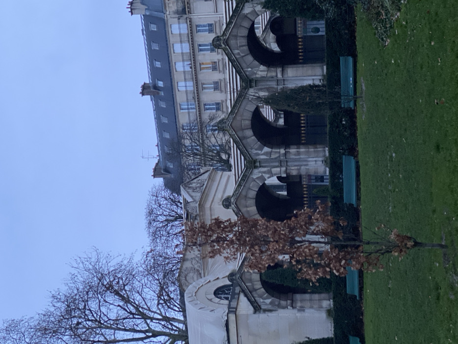 A stone building with arched openings and a white facade is seen next to a tall apartment building. The facade has ornate details and a circular window. In front of the building, there is a tree with brown leaves. To the right of the building, there is a green lawn with benches. The sky is overcast.