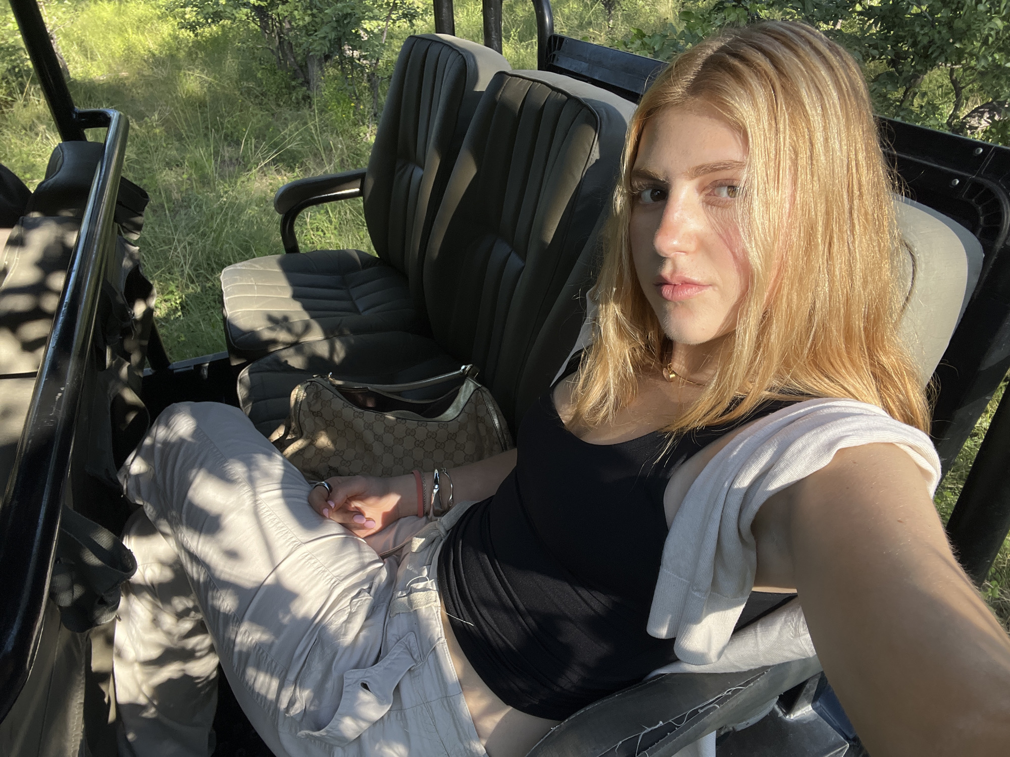 A blonde-haired woman is seated in a vehicle, likely a safari vehicle, in Khwai, Botswana. She is wearing a black tank top, light-colored pants, and has a white sweater or towel draped over her shoulder. A Gucci handbag rests on the seat next to her. The vehicle is parked in a location with dense green vegetation visible in the background.